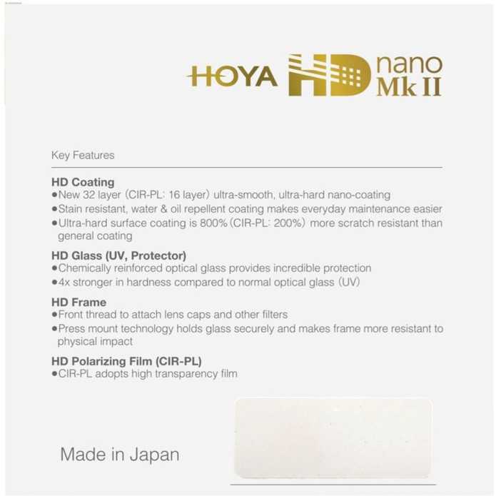 Hoya HD nano CIR-PL polariserende film met hoge transparantie heeft 25% betere lichttransmissie dan standaard polariserende film die wordt gebruikt in de huidige fotografische filters. Dit vertaalt zich in bijna 1/2 stop meer licht dat door de lens binnenkomt terwijl hetzelfde polarisatie-effect wordt verkregen, de kleurbalans wordt behouden en tegelijkertijd het contrast en de helderheid worden verbeterd.